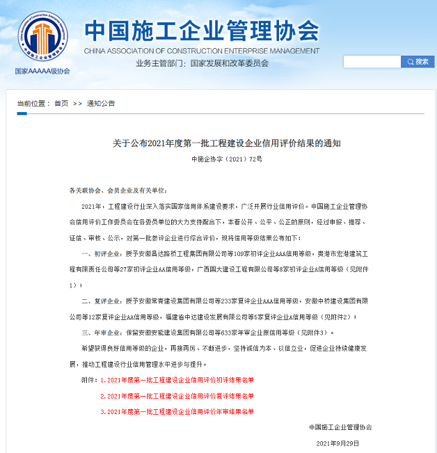 近日,在中國(guó)施工企業(yè)管理協(xié)會(huì)召開(kāi)的2021年度工程建設(shè)誠(chéng)信企業(yè)推介大會(huì)上,公司再次獲得 “2021年度工程建設(shè)AAA信用等級(jí)企業(yè)”和“2021年工程信用7星級(jí)企業(yè)”等共二項(xiàng)榮譽(yù),這也是“十四五”開(kāi)局之年公司全面貫徹新發(fā)展理念、構(gòu)建信用新發(fā)展格局在行業(yè)信用體系建設(shè)方面取得的突出成效。2021年,公司不斷完善信用體系,強(qiáng)化信用導(dǎo)向,企業(yè)管理水平和社會(huì)信譽(yù)度不斷提升。今后公司將以此為契機(jī),不斷總結(jié)經(jīng)驗(yàn),補(bǔ)齊發(fā)展短板,助力企業(yè)高質(zhì)量發(fā)展。