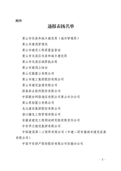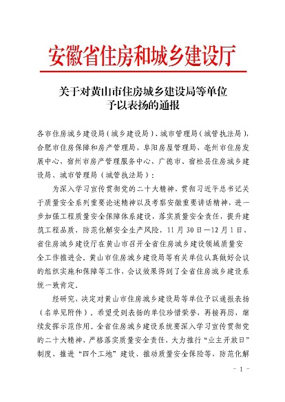近日,安徽省住房和城鄉(xiāng)建設(shè)廳印發(fā)《關(guān)于對黃山市住房和城鄉(xiāng)建設(shè)局等單位予以表揚的通報》,《通報》指出,11月30日-12月1日,省住房和城鄉(xiāng)建設(shè)廳在黃山市召開全省住房建設(shè)領(lǐng)域質(zhì)量安全工作推進(jìn)會,會議效果得到全省住房城鄉(xiāng)建設(shè)系統(tǒng)一致肯定,并對在此次會議認(rèn)真做好組織實施和保障的單位予以通報表揚,黃山市建工集團(tuán)股份有限公司作為唯一一家本土建筑施工企業(yè)榮獲表揚。
